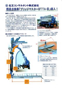 所有しているところあるのですね 先日、帯広の知り合いが宣伝してくれと、 パンフレットをくれたので。 橋梁点検車を所有するとは、 さすがの会社です。 現在5年に1回の橋梁点検が義務付けられているので これは大活躍になるのでしょうね。 釧路では点検車を所有している会社あるのでしょうか? ぜひ1度は乗ってみたいです。