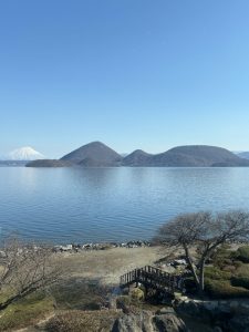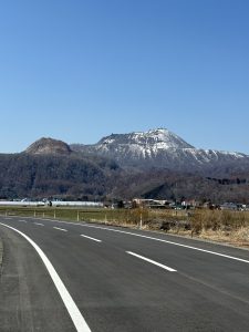 2000年に噴火した有珠山(少し雪が残っている山)と